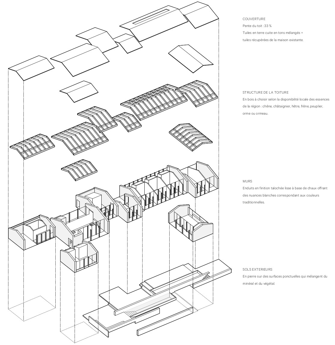 Projet de construction d’une maison de vacances sur l’île d’Oléron, lauréat du concours organisé par Because Architecture Matters et développé en collaboration avec l’architecte Manuel Cervantes et Office Abrami Rojas. La maison est conçue selon les principes du label Passivhaus, intégrant une enveloppe performante, une gestion fine des apports solaires et une optimisation thermique et structurelle de l’ossature bois. L’ouvrage se développe comme une séquence de volumes articulés et une concaténation d’espaces ouverts ; chaque volume possède son espace extérieur dédié, pensé comme le prolongement direct des pièces intérieures. L’organisation spatiale repose sur un système de terrasses décalées en altitude, générant des univers distincts mais interconnectés, adaptés à la vie familiale comme à l’accueil d’invités. Le projet associe un soubassement en béton, assurant stabilité et ancrage au sol, à une superstructure en bois travaillée dans une logique d’intégration au paysage, avec une attention particulière portée à la matérialité, au climat maritime et au rapport entre lumière et protection solaire. La mission comprend la conception structurelle complète, incluant l’étude du soubassement, le dimensionnement des éléments porteurs en bois, la maîtrise des déformations pour garantir la continuité intérieur–extérieur, ainsi que la définition des dispositions constructives compatibles avec les exigences énergétiques du Passivhaus et les intentions architecturales du projet.