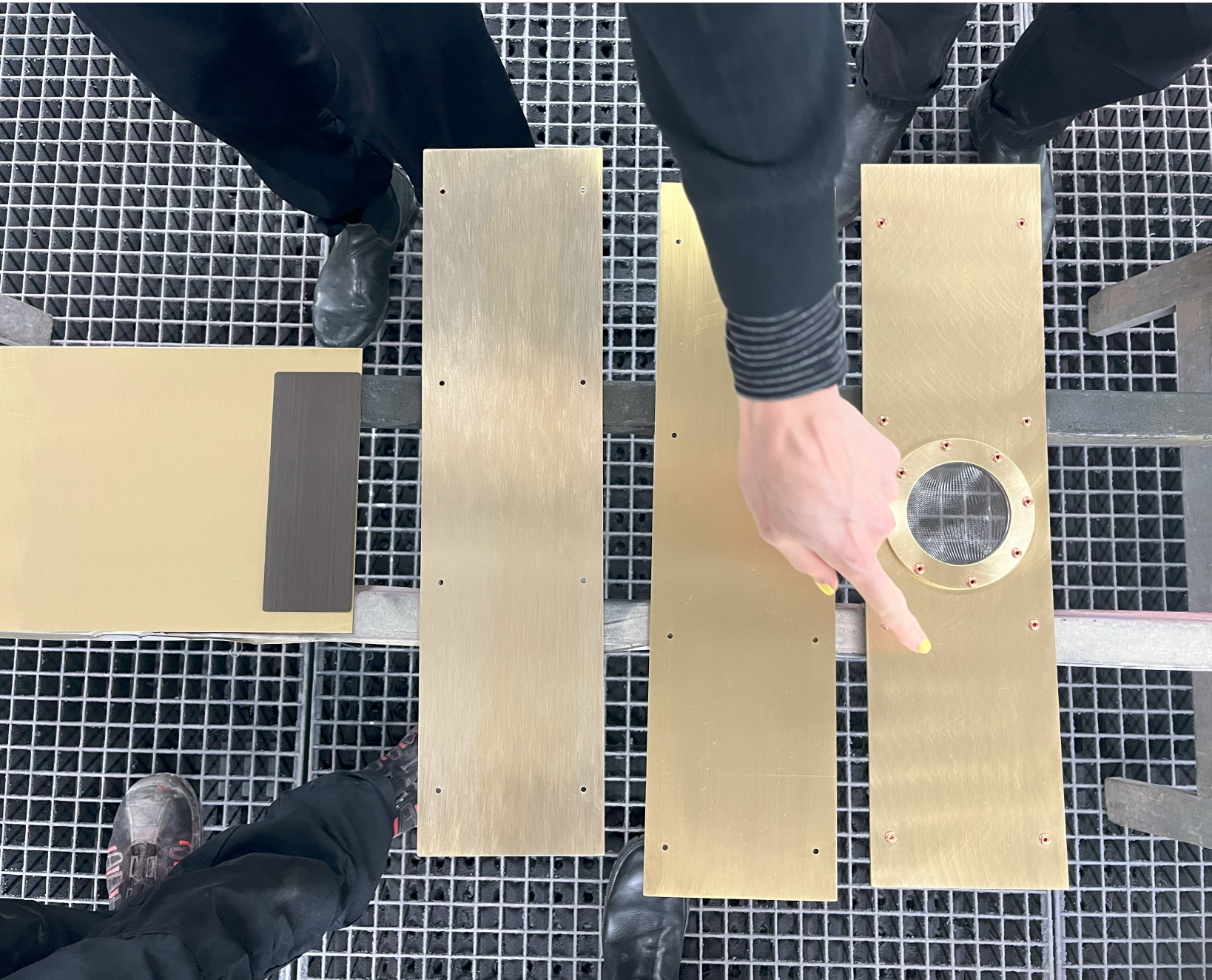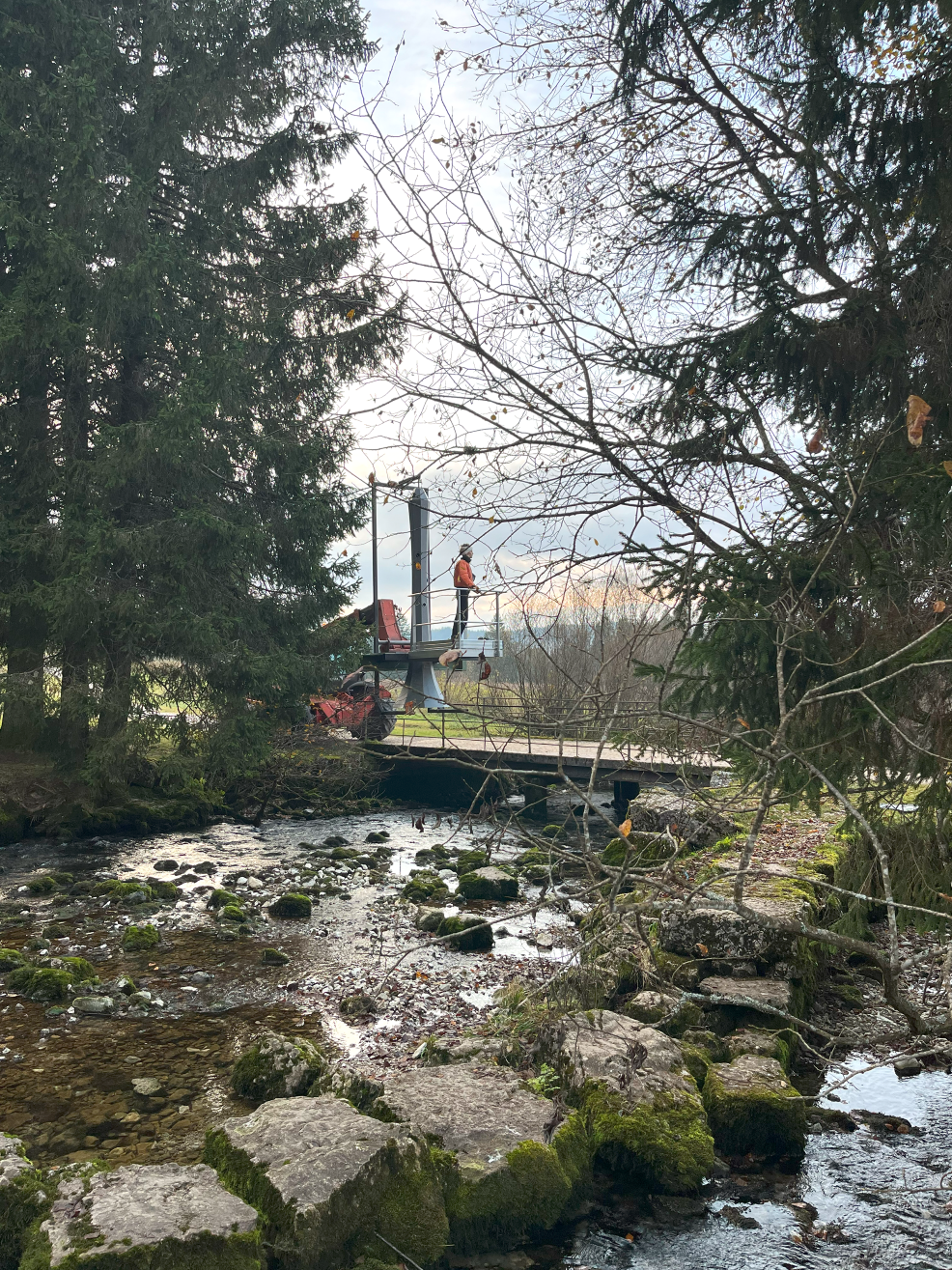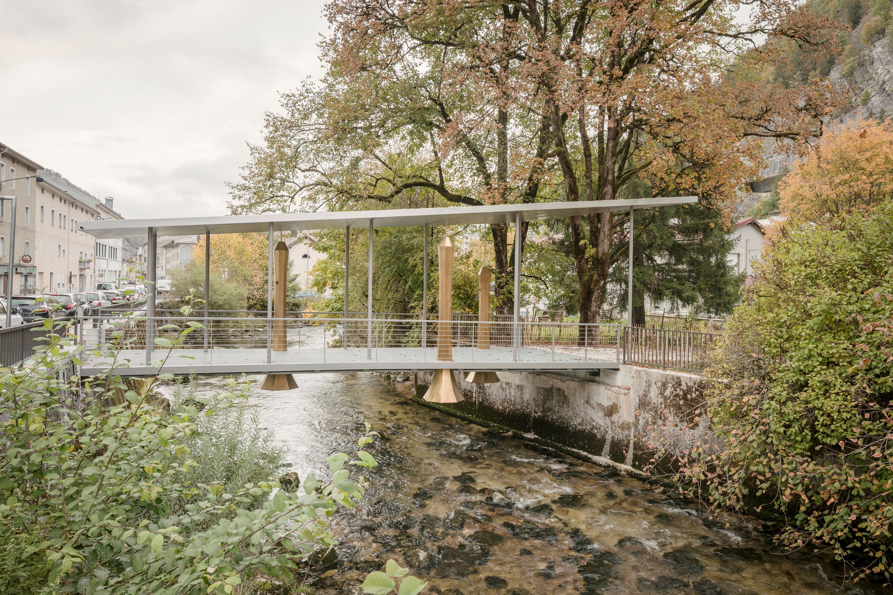 Une rivière décanalisée, désindustrialisée, renaturée, c’est aussi unerivière qui retrouve sa voix. La réappropriation de la Bienne au fil d’une balade piétonne et de mobilité douce devrait donc se faire commeun dialogue, ou plus musicalement, comme un duo, entre visiteurset habitants et la rivière. La passerelle amenant au jardin Lamy jeune (nom qui renvoie à la lunetterie industrielle), réaménagé et ouvert aupublic, en articulera la cadence (l’arrivée) ou l’ouverture (le départ). La passerelle pourrait donc être imaginée comme une suite d’accords qui cherche à évoquer une relation harmonieuse entre homme et paysage par une plongée sonore qui invite à découvrir le milieu aquatique à l’oreille. Le projet artistique prend la forme d’un dispositif immersif sonore et paysager. Il se compose de deux dispositifs acoustiques qui donnent à entendre la voix aquatique multiple de la Bienne et invitent à interagir avec la rivière par l’ouïe : La traversée de la Bienne se fait ici sous les ailes d’un MIROIR ACOUSTIQUE : un toit réfléchissant surplombe la rivière,au-dessus d’une passerelle quasi dématérialisée en caillebotis. L’effet acoustique donne l’impression d’être “dans” la rivière, englobépar une présence sonore augmentée des eaux courantes. L’inclinaison du toit qui s’ouvre vers le parc comme un crescendo d’une partitionmusicale, prolonge la présence sonore de la rivière dans le parc,sa finition crée aussi un reflet optique lumineux. Trois INSTRUMENTS D’ÉCOUTE accompagnent et rythment la traverséesur passerelle du Jardin Lamy, et donnent accès à une écoute locale précise et musicale, plus intime et proximale, à différents endroits. L’ouvrage traverse la Bienne au niveau du nouveau parc Lamy Jeune,entre le parc et la rue de la République. Le franchissement, d’une portée d’environ 13.5 mètres, traverse la rivière Bienne de manière perpendiculaire aux deux rives. La largeur de la Bienne au droit du franchissement est de 11.20 m environ. La largeur du tablier est variable entre 3.2 m côté rue de la République et 3.6 m côté parc. La largeur minimale de passage libre qui tient compte de la présence des tubes d’écoutes et des poteaux de la toiture est de 2.4 m. Ces dimensions permettent de respecter les 2 m minimum demandés auprogramme.