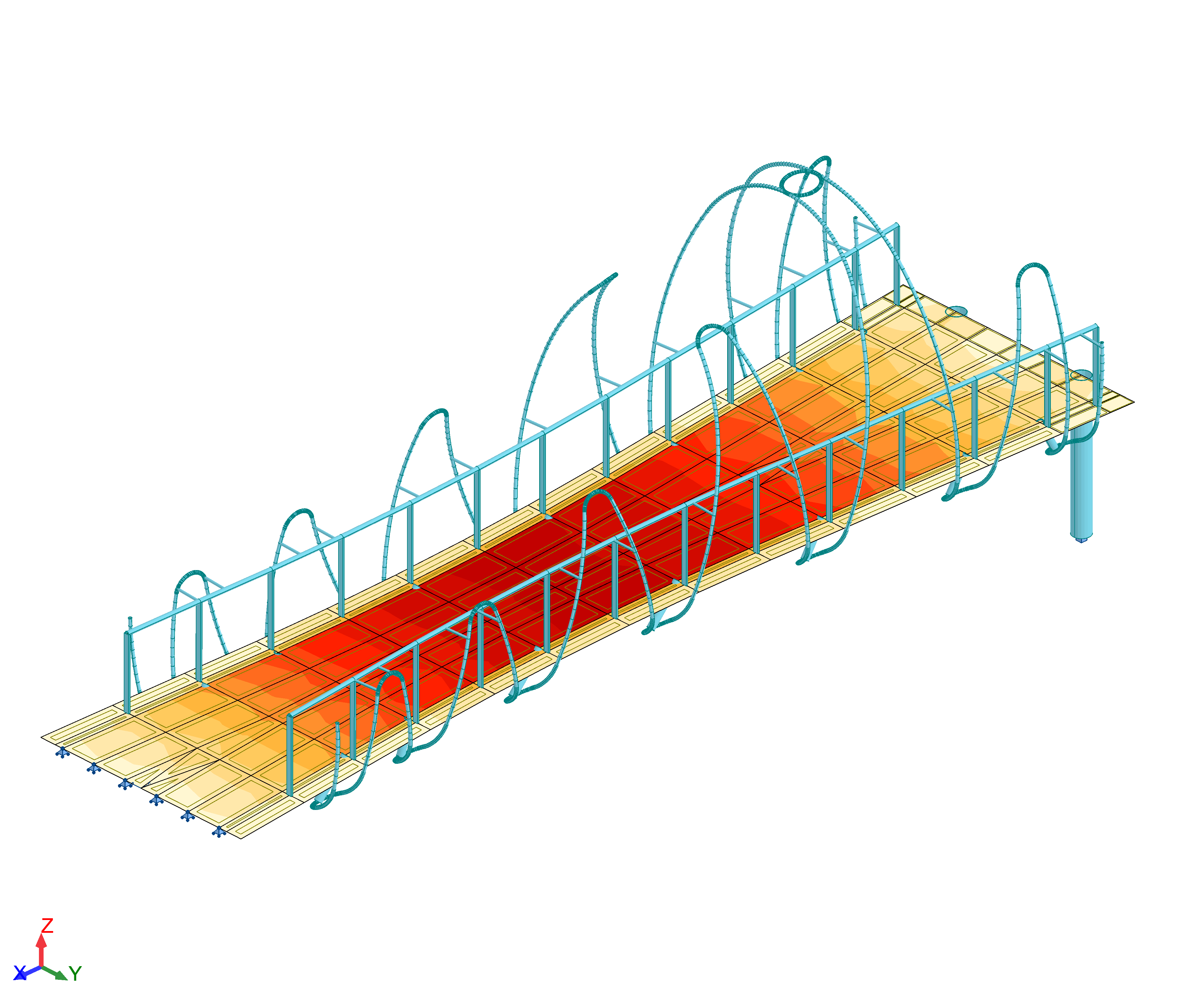 Les installations sculpturales basées sur des modules, composées decentaines de petits modules en acier, apparaissent comme une métaphorebiologique : des cellules qui éclosent et s’épanouissent en libérantdes composants moléculaires en dialogue avec l’espace, sedéveloppant de manière totalement autonome et autosuffisante. Chaque module en acier est répété et s’emboîte dans celui à côté, etles vis qui les relient doivent seulement être légèrement modifiées pourdonner une nouvelle inclinaison et une nouvelle apparence à toute lastructure, qui est donc différente à chaque fois qu’elle est assemblée. La partie structurelle de la sculpture repose sur un dessin sinusoïdalqui reflète à la fois le mouvement physique et le son des vagues del’eau de la rivière sous la passerelle, créant une sorte d’écho tridimensionneldes vibrations naturelles. L’ouvrage traverse la Bienne au niveau de l’Hôtel de Ville entre la placeJean Jaurès et le quai Jobez. Le franchissement, d’une portée d’environ13 mètres (13.05 entre axes des appuis), traverse la rivière Biennede manière perpendiculaire aux deux rives. La largeur du tablier estvariable entre 3 m côté place Jean Jaurès et 4 m côté quai Jobez. La passerelle se compose d’une seule portée isostatique en béton dehauteur 40 cm. Le tablier de type dalle en béton armé supporte le traficpiétons ainsi que l’oeuvre d’art en acier inox.