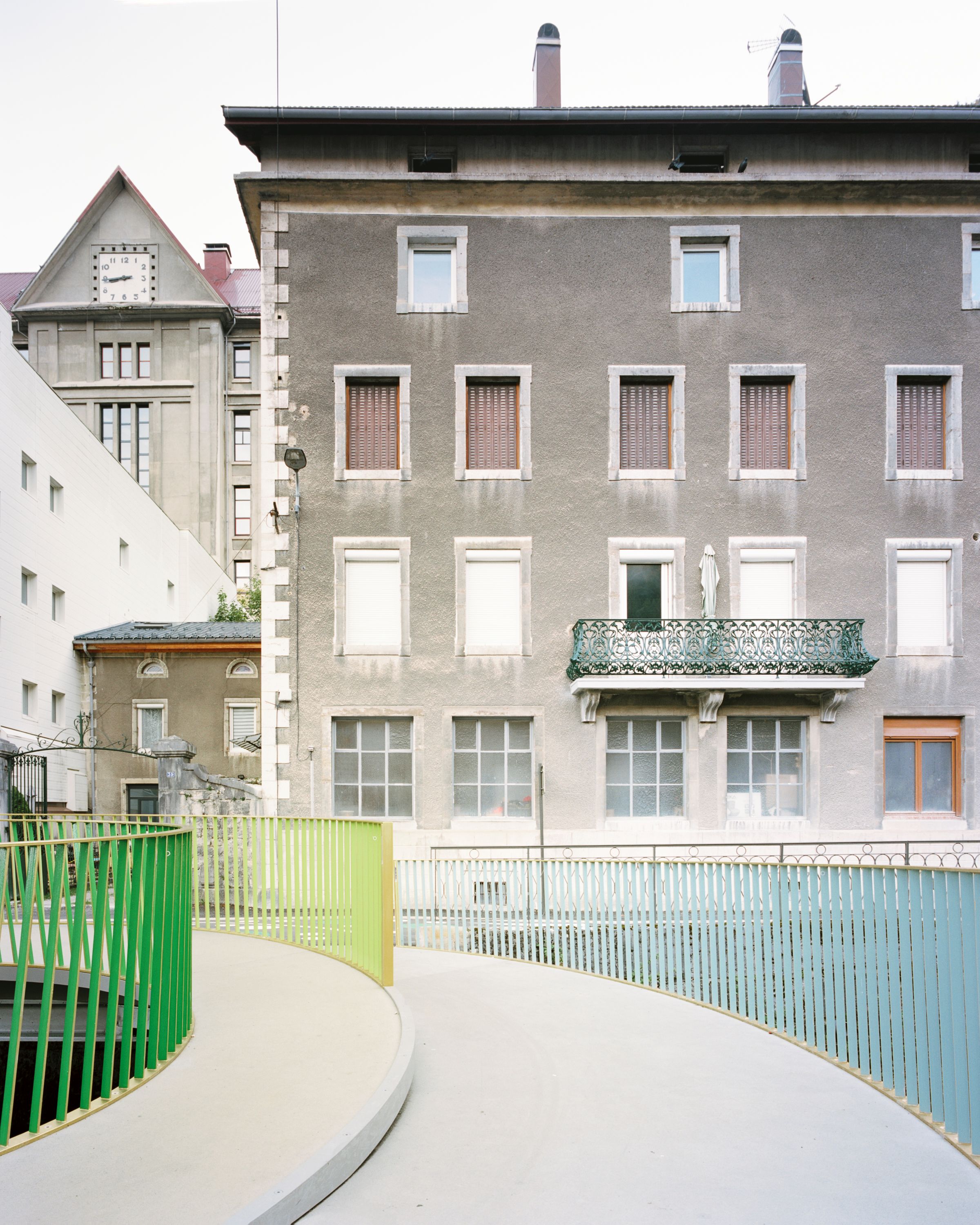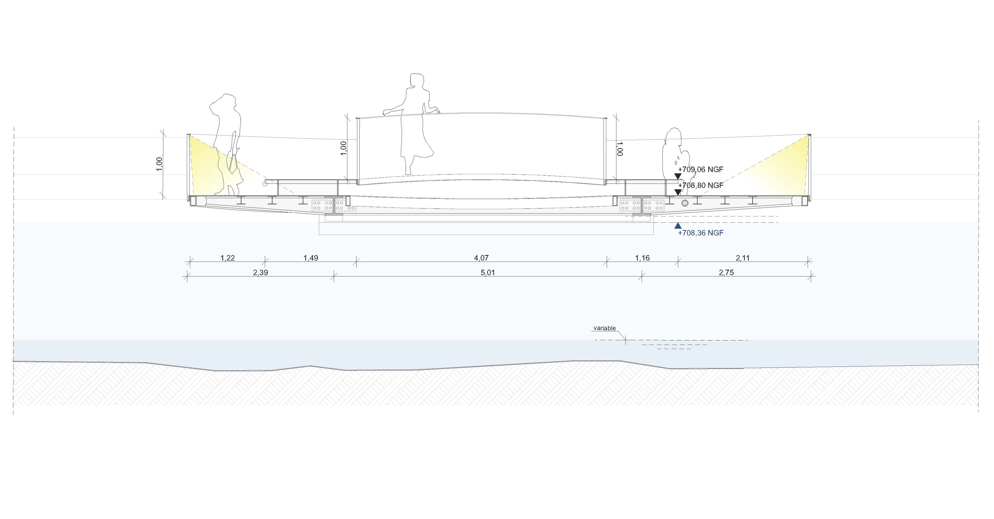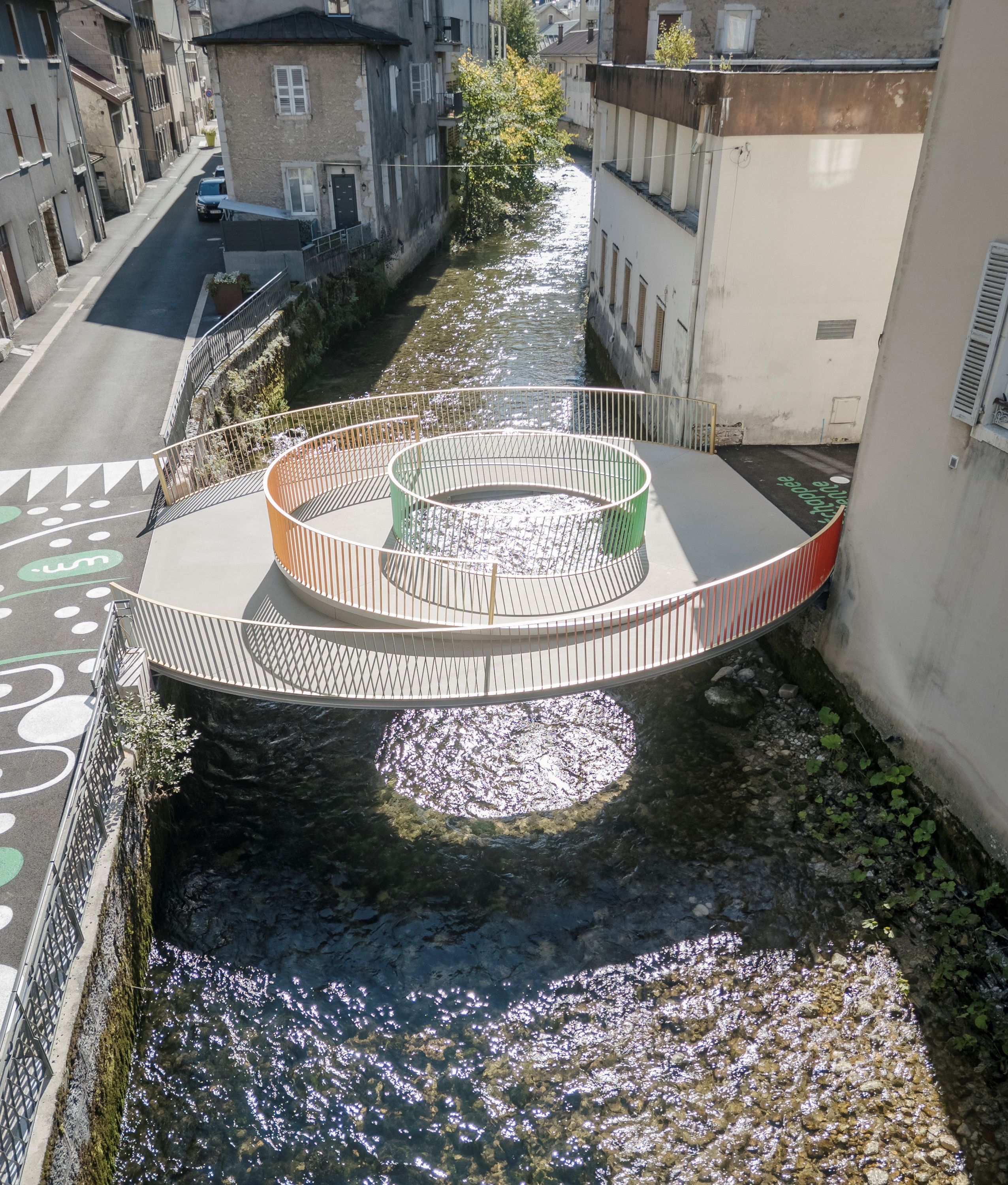 C=2?r=?ø est à la fois une oeuvre artistique et un ouvrage d’art. Saconception se veut au plus près des objectifs de la commande enpriorisant l’usage et les usagers. C=2?r=?ø fonctionne en écho avecles spécificités de la ville de Morez, son passé et son avenir tout enproposant une réponse novatrice au programme Échappée Bienne. Par sa configuration, elle permet bien entendu le passage d’une riveà l’autre tout en offrant des points de vue sur la rivière et son environnementnaturel et urbain. Par sa forme circulaire, elle proposeune nouvelle idée de la passerelle, à la fois observatoire et objet de franchissement. Sa forme circulaire évoque une placette, et entre enrésonance formelle avec les verres et les lentilles de lunettes, industriefortement ancrée dans l’identité de la Ville. Les surfaces de la passerelle répondent aux normes PMR, un légerdénivelé a été calculé à cet effet, pas de marches ni de ruptures franches. Ici, par un savant calcul, il est possible de franchir en douceur l’ensemble de l’ouvrage. Les gardes corps côté sud répondent à toutes les normes, y compris cyclables. Le revêtement au sol esttraité par une résine antidérapante. De nuit, la mise en lumière balise précisément le parcours. Au sol, un léger relief permet aux personnesmal voyantes de saisir la configuration du site. Si les normes sont souvent complexes, elles participent ici directement à la proposition formelle, artistique, et technique de l’ensemble. L’ouvrage traverse la Bienne au droit de l’entrée historique du lycée Victor Bérard. Avec une structure métallique type réseau de poutres et tôle circulable, le franchissement se compose d’une partie basse accessible PMR et cycles et d’une plateforme surélevée en partiecentrale. Le centre de la plateforme est évidé et protégé par ungarde-corps. En plan, l’ouvrage est un disque de forme elliptique, évidé en partie centrale selon un rayon de 2.10m environ. La structure du tablier est un réseau de poutres métalliques, composée d’une tôle supérieure, de poutres principales type HEM280 et depoutre secondaires type IPE140 et IPE100.