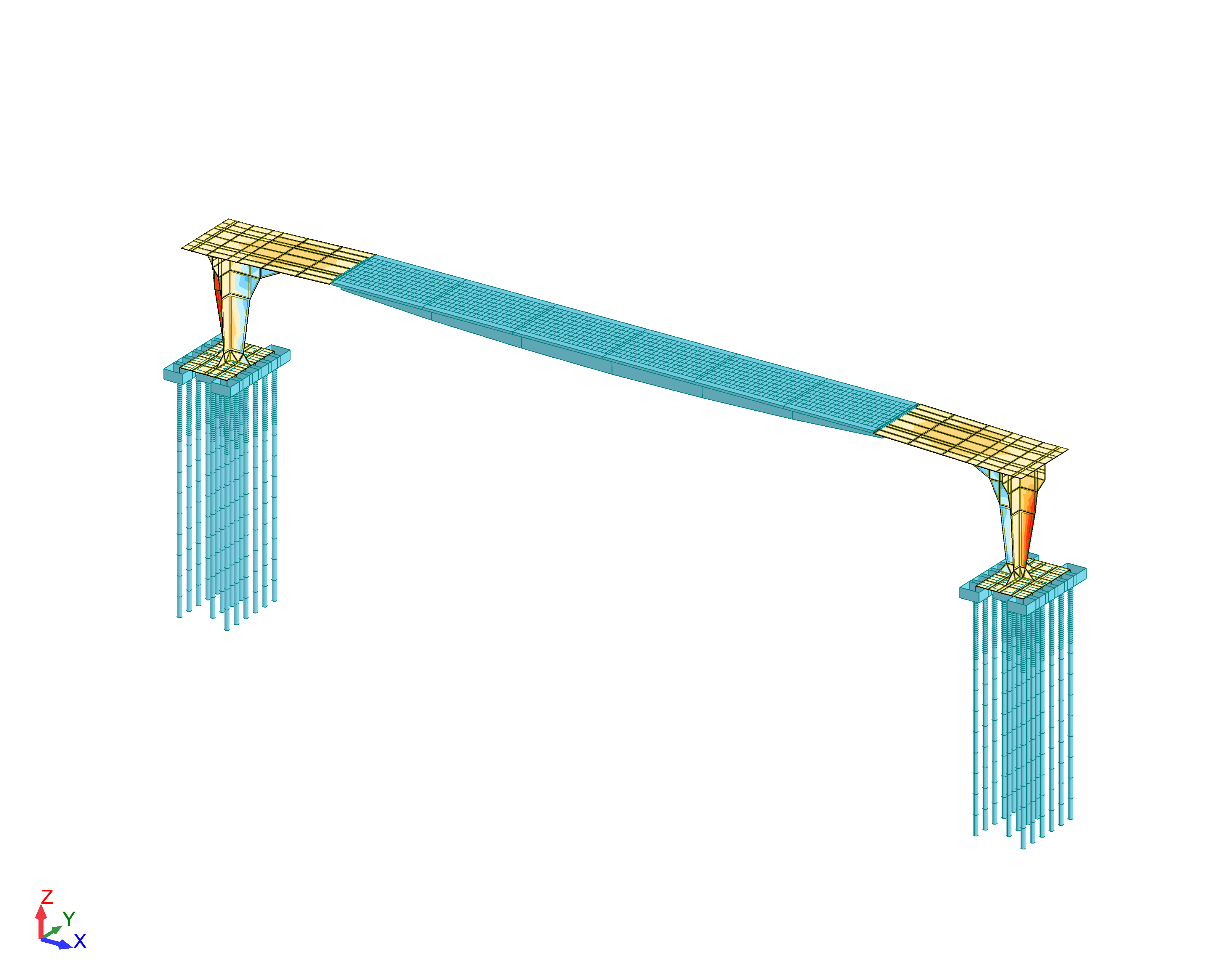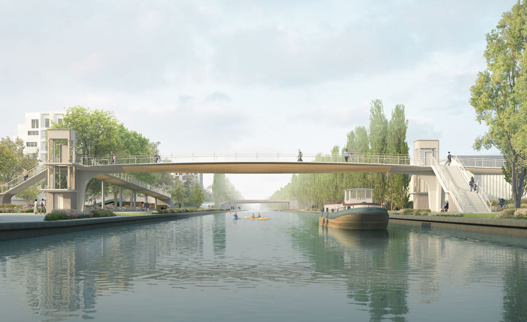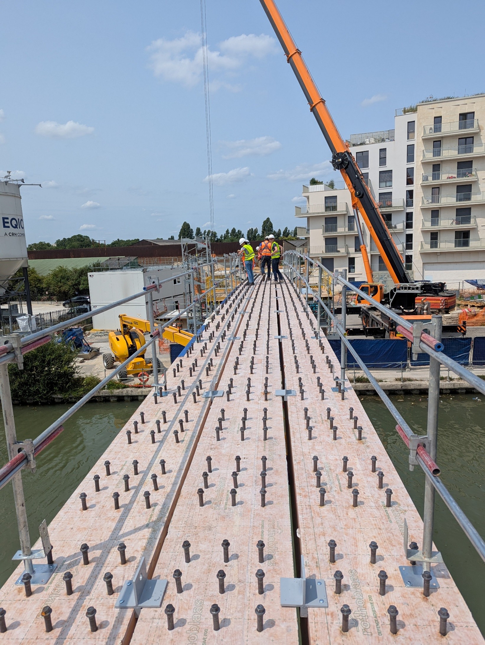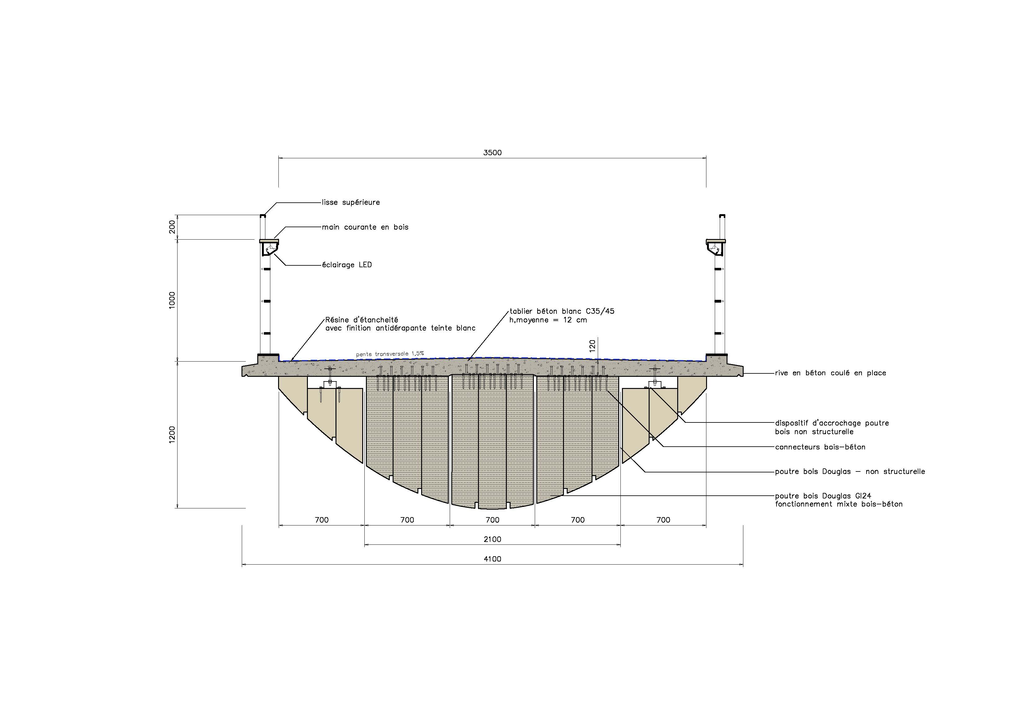 Le nouveau franchissement du canal de l'Ourcq à Bondy est un portique composé en partie supérieure d’une poutre mixte bois/béton et de deux consoles en béton, d’une portée totale de 41.5m et de largeur constante de 3.50m. La travée principale est constituée de nervures en bois lamellé-collé de hauteur variable, surmontées d'une dalle de compression en béton armé. Des connecteurs métalliques relient les deux matériaux, formant une structure sans joints transversaux aux extrémités. Cette conception semi-intégrale élimine les joints de dilatation, améliorant ainsi la durabilité en réduisant le risque d’infiltrations d'eau vers les éléments en bois. La suppression des joints de dilatation transversaux et longitudinaux confère au pont le fonctionnement d'un portique semi-intégral. Ceci réduit la maintenance et accroît sa durabilité. La géométrie de la section transversale est conçue pour éviter le contact direct des faces latérales des poutres porteuses avec la pluie. Un angle de 45° permet à la dalle supérieure de protéger efficacement le bois. Grâce à ces dispositions, il a été possible de retenir, tout en préservant une durée de vie de 100 ans, du bois de sapin de Douglas non traité, naturellement de classe 2 (NF EN 335).