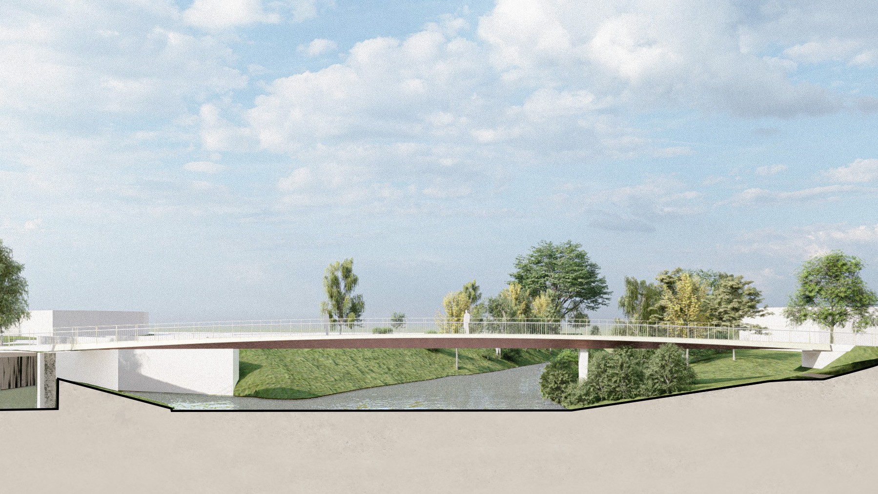 La passerelle franchit la Moder à proximité de sa confluence avec le Rothbaechel, sur le territoire de la commune de Bischwiller. Le projet offrira un franchissement de 3m de large utile, pour un usage mixte vélo/piéton et accessible aux personnes à mobilité réduite. Cette traversée apaisée, à distance de la circulation routière permettra de profiter de la belle profondeur de champ sur la rivière que la végétation de ces berges dissimule depuis deux rives. La conscience de l’hétérogénéité du site, de la proximité à des éléments patrimoniaux remarquables, mais également la qualité paysagère qu’offre la traversée, nous a dirigés vers une passerelle volontairement fine et sobre, ne cherchant pas à se surimposer dans son contexte.La nouvelle passerelle est implantée au nord du pont existant de la D337, à une distance d’environ 5 mètres. Elle se compose d’un tablier métallique de 3 mètres de largeur utile, pour une longueur totale de 54 mètres, répartie en deux travées de 17 mètres et 37 mètres. Le tablier est constitué d’un caisson métallique en acier autopatinable, d’une largeur constante de 3 mètres et d’une hauteur variable. La hauteur structurelle minimale, de 30 centimètres, se situe aux extrémités de l’ouvrage, au droit des culées. La hauteur maximale atteint 99 centimètres au centre de la travée principale.