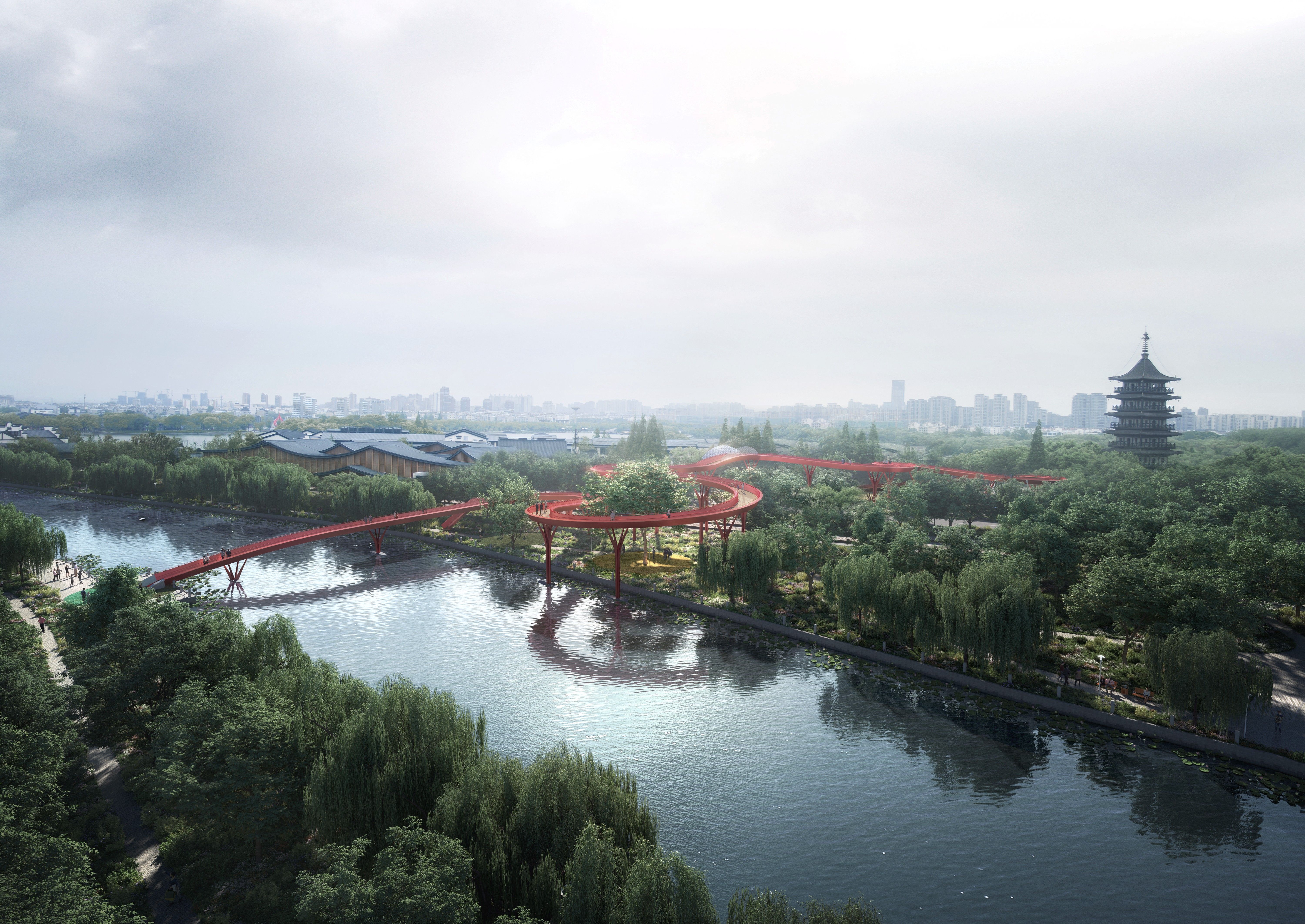 Le contexte urbain et paysager de la ville de Jiaxing est fascinant par sa complexité. Territoire millénaire profondément transformé au cours de l'histoire ancienne et, plus récemment, par d'importants travaux d'infrastructure et d'urbanisation, Jiaxing abrite une prospérité où tradition et modernité coexistent harmonieusement. Le chemin que nous proposons serpente à travers la végétation tel un ruban de soie écarlate, léger et voluptueux, guidant le piéton/spectateur en douceur vers le spectacle qui se déploie à ses pieds. La modularité de la passerelle et la proximité de ses pylônes permettent d'envisager des raccordements ultérieurs, tels que des escaliers, au fur et à mesure de l'évolution du paysage et des infrastructures.La structure verticale est composée de fins pylônes métalliques qui se ramifient comme des arbres stylisés, évoquant le paysage naturel sur lequel repose la passerelle.Les pylônes supportent une plateforme de 2,5 m de large, suffisamment large pour permettre le passage simultané de cyclistes et de piétons. L'espace libre sur la voie est de 8,35 m, plus 0,2 m de marge de sécurité. L'espace libre sous la passerelle correspond à un rectangle de 12 m sur 5 m.